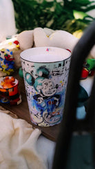 At first glance, this set of three candles appears to be a colorful representation of popular characters, yet a closer consideration reveals a much bolder and more contemporary form of primitivism inspired by the work of Julio Parra.